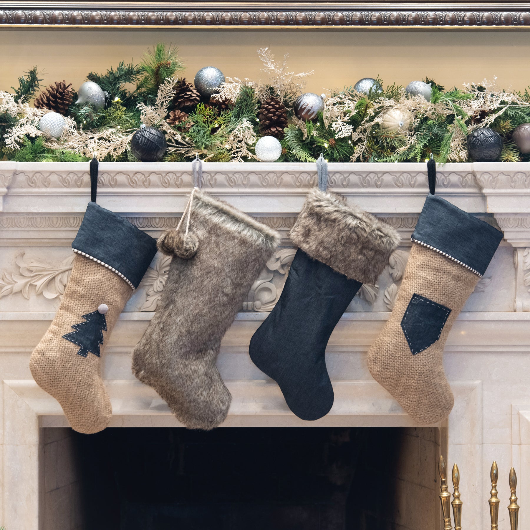 With warm earth tones blended with jute and luxuriously soft faux fur, the Rustic Fireside Collection creates an invitingly rustic holiday display. The dress denim and ticking stripe designs adds a fresh and chic take on Christmas décor.